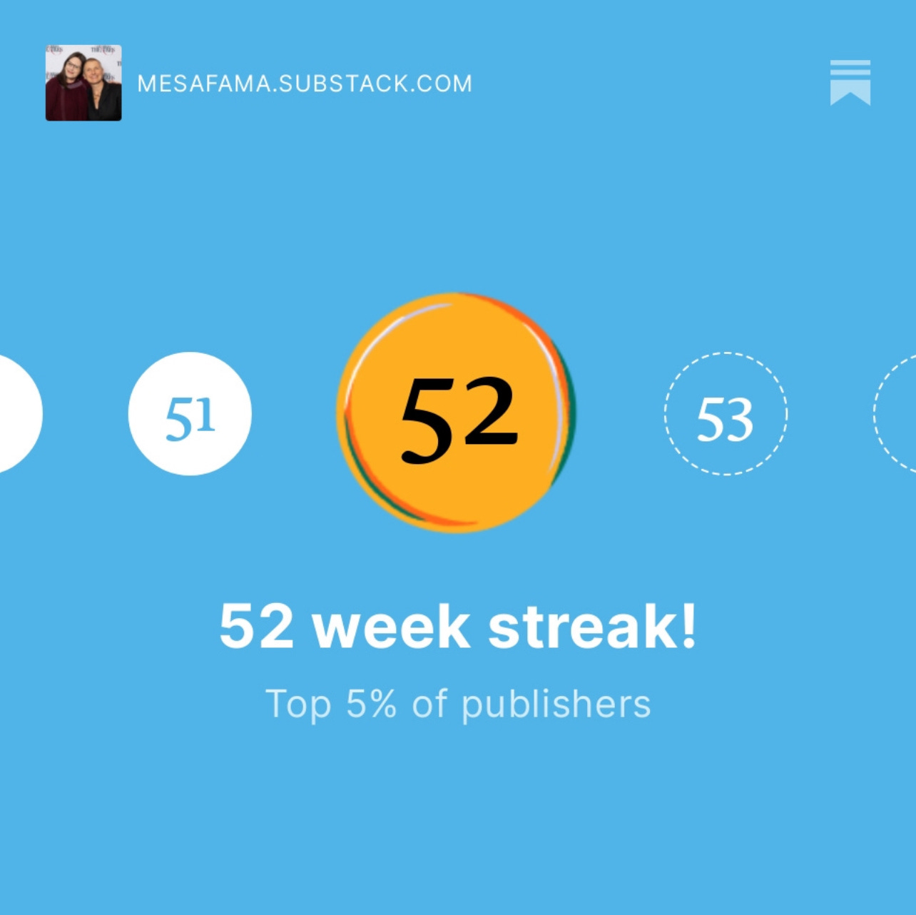 This is worth celebrating Mesa! At 47 weeks in a row, I am not far behind you. There are so many things in this life I have to drag myself to do—but not the writing I do here on Substack. That is a joy, a ride, a wonder…every time. I find myself swept along in this great human tide of extraordinary writing here on Substack. Like you, Mesa. Let’s keep going, shall we?